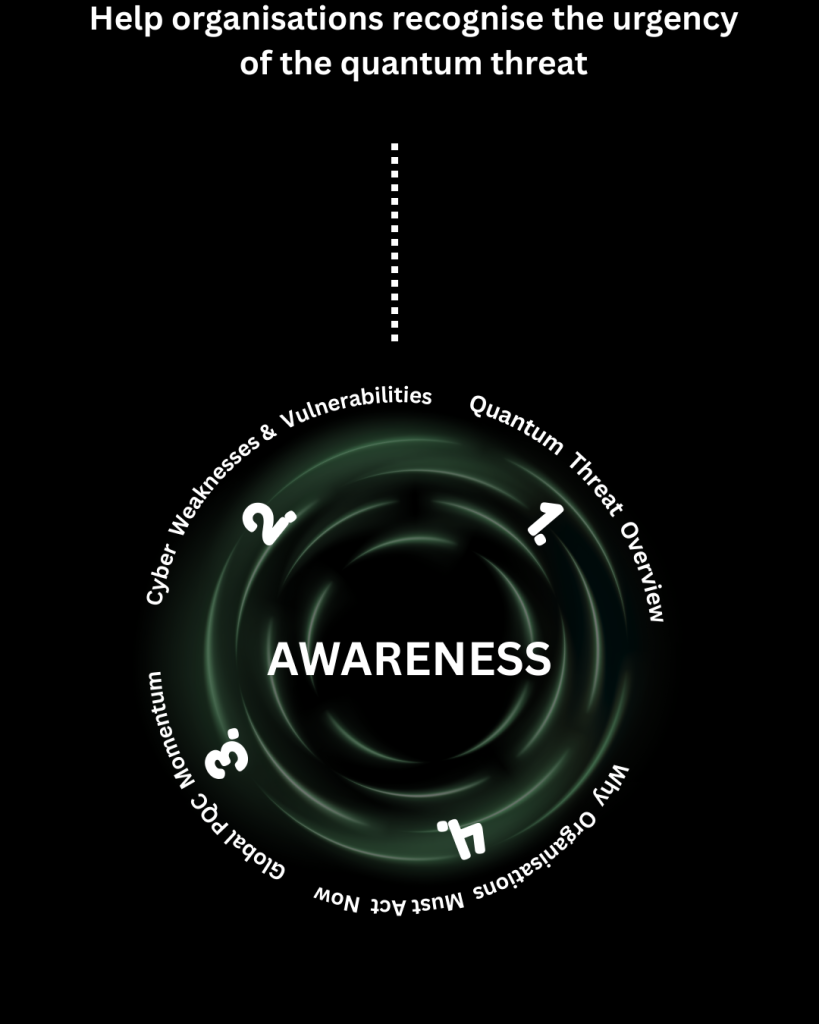 The Awareness phase is designed to help organisations build a clear and practical understanding of the emerging quantum threat and why early preparation matters. It begins with a Quantum Threat Overview, outlining how advances in quantum computing will challenge existing cryptographic foundations and security models.